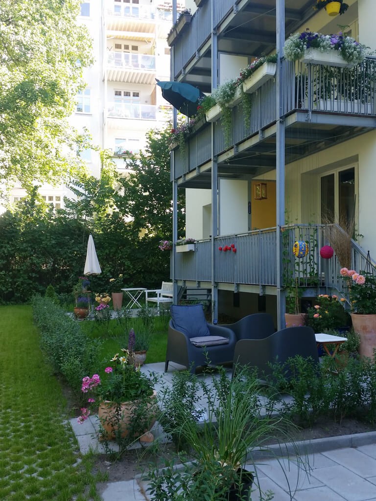 Die Erdgeschosswohnungen haben jeweils einen kleinen Mietergarten mit Terrasse und Rasenfläche.